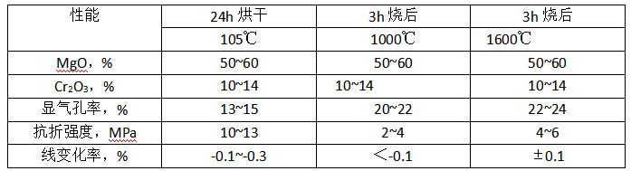 典型鎂鉻質澆注料的理化性能見表1-1。