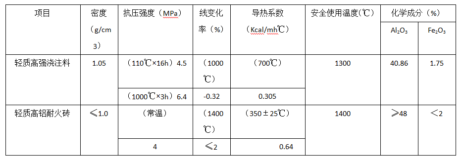 由表1可看出:這兩種爐襯材料除密度和安全使用溫度基本相同外,其它指標輕質高強澆注料均優于輕質高鋁耐火磚。