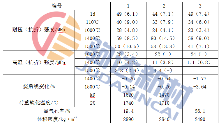 電熔鋁酸鹽水泥耐火澆注料配制時(shí),水泥用量為18%,耐火粉料采用電熔剛玉粉,耐火骨料最大粒徑為5mm,其顆粒級配(%)為:5~3mm,30~40;3~1m;25~30mm;<1mm,35~45。同時(shí)用緩凝劑和減水劑等復(fù)合外加劑。該澆注料成型初凝后,因水化熱在8h內(nèi)放出較多,故應(yīng)在潮濕環(huán)境中自然養(yǎng)護(hù),或進(jìn)行標(biāo)養(yǎng),但不宜放進(jìn)水中養(yǎng)護(hù)。養(yǎng)護(hù)到期后,檢驗(yàn)常溫強(qiáng)度。烘干后,檢驗(yàn)各種高溫性能,詳見表1-1。表中編號1、編號2和編號3,分別用電熔剛玉、燒結(jié)剛玉和一級礬土熟料作耐火骨料,其水用量分別為9%,8.7%和12%。從表中看出,1天常溫耐壓強(qiáng)度達(dá)到43~50MPa,顯示了快硬旱強(qiáng)的特點(diǎn),其強(qiáng)度已占總強(qiáng)度的80%左右。