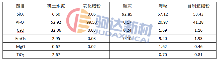試驗用原材料為礬土水泥,陶粒,氧化鋁粉,硅灰,自制超細(xì)粉(粘土質(zhì)),分散劑等。其化學(xué)成分如表1。