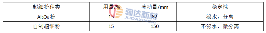 在同一配合比中,對氧化鋁粉與自制超細(xì)粉(粘土質(zhì))按等重量進(jìn)行互換,分別測定流動值。比較二者的作用(見表4),自制超細(xì)粉的性能優(yōu)于氧化鋁粉。