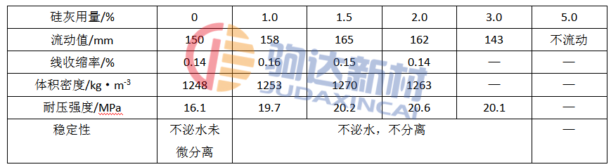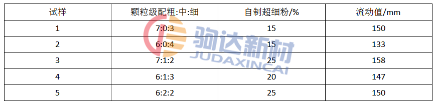 骨料對流動性的影響表現(xiàn)在多方面:顆粒形狀,級配,粒徑,吸水性等。顆粒的形狀愈接近球形,顆粒間相互接觸的面積愈小,流動性愈好。骨料的吸水性小,則混合料用水量在較小的情況下就足以保證形成溶膠并使顆粒之間能夠自由流動。顆粒級配是影響流動性能的重要因素。該試驗中顆粒范圍為:粗顆粒5〜1.2 mm;中顆粒1.2〜0.3mm;細(xì)顆粒0.3〜0.045mm;超細(xì)粉< 0.045mm。細(xì)粉用量不足時,骨料與細(xì)粉之 間存在著分離傾向,流動性差或不流動;中顆粒用量較多時,因骨料之間的直接接觸,使流動性顯著下降;細(xì)粉用量過多時,則施工后細(xì)粉產(chǎn)生分離現(xiàn)象,或產(chǎn)生高粘度,影響流動性。采用不同的粗中細(xì)顆粒級配,觀察其相應(yīng)的達(dá)到穩(wěn)定的流動性時所需的超細(xì)粉最小用量,試驗結(jié)果見表3。