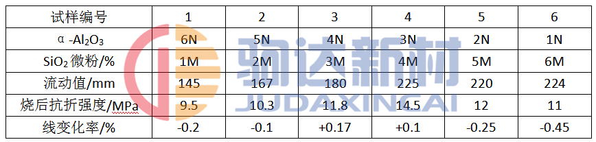 (1)物料的顆粒組成和微粉、水泥、外加劑、膨脹劑的加入量對澆注料的流動值等性能有較大影響,是保證莫來石質自流澆注料性能的關鍵。
