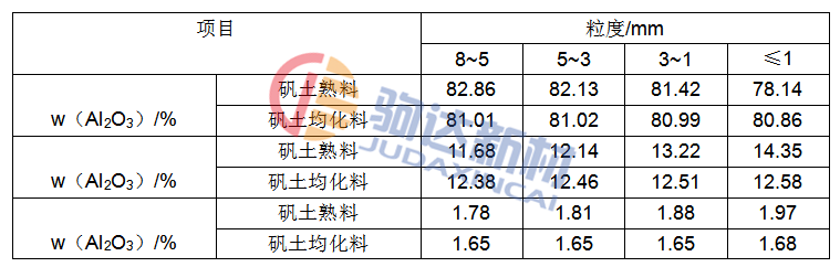 通過比較兩種礬土原料的物理化學(xué)性能可見,經(jīng)過均化提純處理的礬土均化料,無論其塊料還是各粒級(jí)的顆粒,均較飯團(tuán)糊料表現(xiàn)出良好的均一穩(wěn)定性。