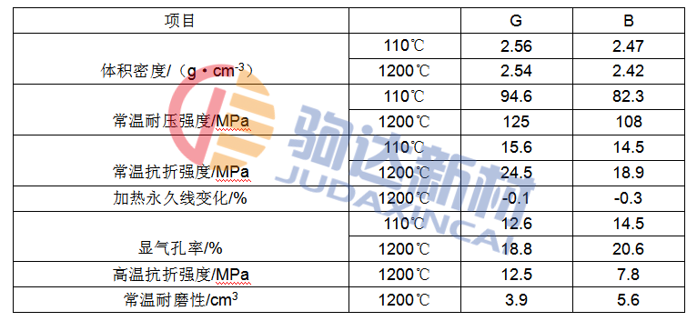 2.2 兩種礬土原料所制澆注料的性能