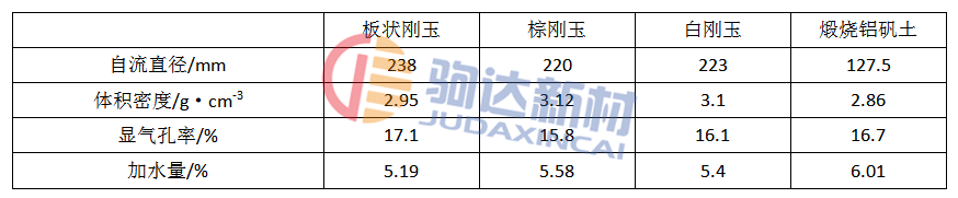 表2示出了用不同氧化鋁作原料時制備的樣塊的性能。n為0.23的澆注料用板狀剛玉作原料時,自流性能似乎最理想。也可以說,白剛玉和棕剛玉可作為生產(chǎn)自流澆注料的替代原料。然而澆注料用煆燒鋁礬土?xí)r,要獲得好的流動性能,振動是很必要的。