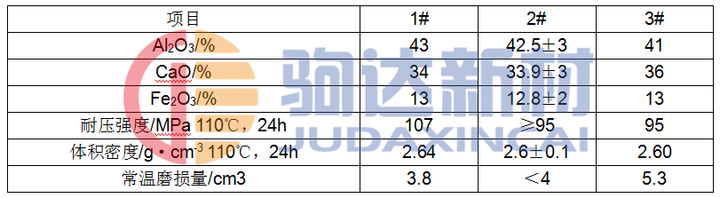 將上述原料磨成粒度≤0.088mm的共磨粉后,加結(jié)合劑在濕碾機中混煉,混好的泥料壓制成荒坯,干燥后入隧道窯燒成,燒成溫度1620℃。燒后的合成料理化指標為:Al2O3 40.49%,F(xiàn)e2O3 13.6%,CaO 39.41%,SiO2 1.20%,體積密度 3.13g·cm-3,吸水率0.7%。