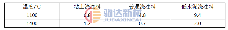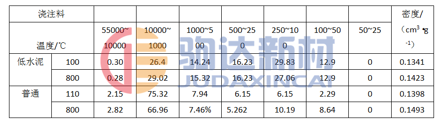 低溫時(shí)低水泥澆注料與普通澆注料的總孔隙相近。高溫加熱時(shí)低水泥澆注料變化不大,普通水泥澆注料總孔隙增加4%。