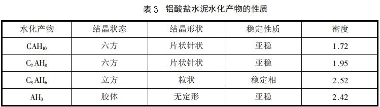 鋁酸鈣的各種主要水化產物的性質如表3所示。