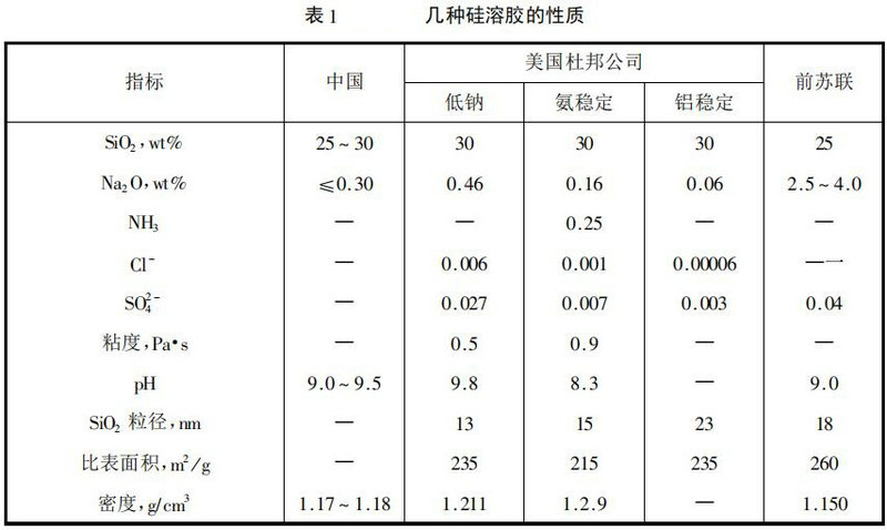 硅溶膠即硅酸溶膠,呈乳白色膠液,帶負電性,其通實為xSiO2·H2O,由下列成分構成:偏硅酸(H2SiO3),二偏硅酸(H2SiO2)2,和正硅酸(H4SiO4)。膠體粒子約10~80mm。硅溶膠的制備方法很多,如水解四乙氧基甲硅烷:電解、滲析、電滲析硅酸鈉溶液:水解四氯化硅或硅酸酯:用氣態氟處理硅酸鈉:分散硅凝膠懸浮液等。最廣泛使用的方法有酸法、離子交換法和電滲析法。各種硅溶膠的性質如表1