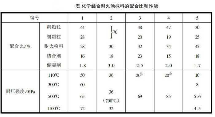 下表為化學(xué)結(jié)合耐火涂抹料的配合比和性能。水玻璃溶液密度1.38g/cm³,磷酸鋁溶液密度1.56g/cm³。編號(hào)1和編號(hào)3,分別為黏土熟料和礬土熟料骨料,其顆粒級(jí)配:2.5~0.5mm70%,<0.5mm30%:編號(hào)2為鋁鉻渣骨料,臨界粒徑為5mm;編號(hào)4為剛玉骨料,粗顆粒為16號(hào),細(xì)顆粒為80號(hào);編號(hào)5為黏土熟料骨粉料,粉料中含12%的軟質(zhì)黏土,臨界粒徑為5mm;耐火粉料:編號(hào)4為混合320 號(hào)剛玉粉,其余的為礬土熟料粉,細(xì)度小于0.09mm 的占90%以上;編號(hào)1和編號(hào)2分別用氟硅酸鈉和硅酸鹽水泥作促凝劑。編號(hào)3和編號(hào)4 摻加1.0%~2.5%的氫氧化鋁粉。編號(hào)3~5用鋁酸鹽水泥作促凝劑。