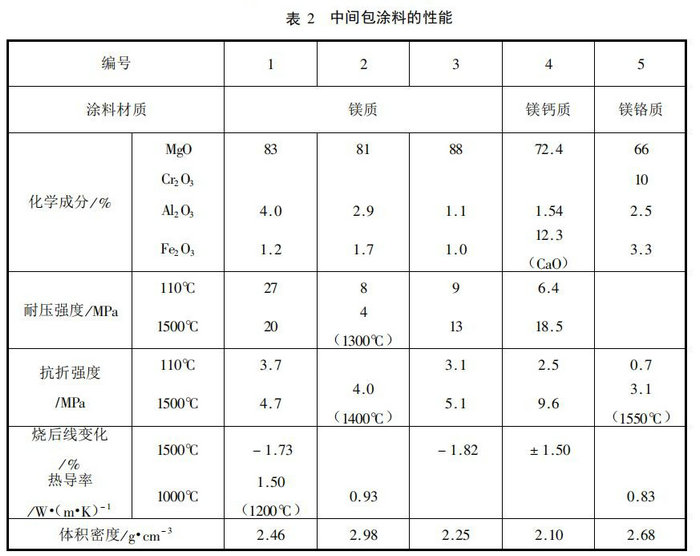 中間包耐火涂抹料簡(jiǎn)稱中間包涂料,分為鎂質(zhì)、鎂鈣質(zhì)和鎂鉻質(zhì)3種,其性能見表2。編號(hào)1用燒結(jié)鎂砂作原材料,其臨界粒徑為3mm,大于1mm的用量35%,1~0.09mm的用量25%,小于0.09mm的用量30%,其余為結(jié)合劑和外加物,用水拌和即可使用;編號(hào)2與編號(hào)1的配制原則,基本相似,小于3mm的耐火骨料55%~65%,耐火粉料30%~40%,軟質(zhì)黏土約為5%,三聚磷酸鈉3%左右,緩凝劑0.6%~1.0% ,水用量為12%~15%;編號(hào)3為優(yōu)質(zhì)鎂砂作耐火骨粉料,摻加軟質(zhì)黏土和SiO2超微粉,結(jié)合劑為三聚磷酸鈉,同時(shí)摻加防爆劑金屬鋁粉或纖維;編號(hào)4以燒結(jié)鎂砂為主料,摻加適量的鈣質(zhì)材料、硅微粉和復(fù)合外加劑配制成的,用聚磷酸鹽作結(jié)合劑;編號(hào)5為鎂鉻質(zhì)涂料,是由燒結(jié)鎂砂、鉻鐵礦、軟質(zhì)黏土、三聚磷酸鈉和消石灰組成的。