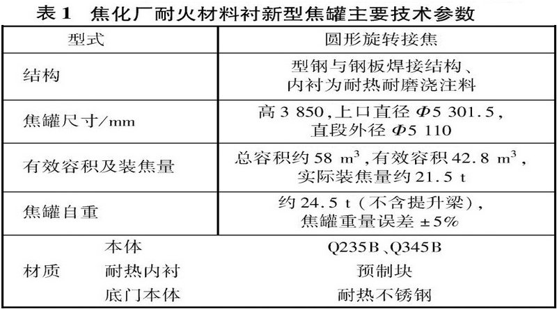 耐火材料襯新型焦罐是在不改變?cè)瓊鹘y(tǒng)合金襯板焦罐外形尺寸的前提下,采用耐火材料替代原合金襯板,用整圈鋼板替代原有框架結(jié)構(gòu)的技術(shù)。它的特點(diǎn)是根據(jù)罐體不同部位的工況采用不同材質(zhì)的耐火材料內(nèi)襯和不同的施工工藝。新型焦罐主要技術(shù)參數(shù)見表1