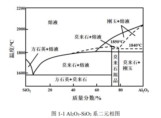 耐火澆注料是由一定級配的骨料、細粉、結合劑和外加劑按一定比例組成的耐火混合料,因其具有生產(chǎn)工藝簡單、生產(chǎn)周期較短、節(jié)能等優(yōu)點被廣泛使用。 鋁系列耐火澆注料是由 Al2O3SiO2作為基本化學組成的耐火澆注料。鋁系列耐火澆注料的相組成可以從 Al2O3-SiO2 系相圖得到。從圖1-1可以看出,Al2O3的熔點為2050 ℃SiO2的熔點為1723 ℃。在該系統(tǒng)中唯一穩(wěn)定的二元化合物為莫來石其化學組成為3Al2O3·2SiO2(Al2O371.8%SiO228.2%),莫來石的熔點為1850 ℃。由于莫來石的存在,系統(tǒng)被劃分為兩個子系統(tǒng):SiO2-莫來石子系統(tǒng),固化溫度為1595 ℃,共晶點組成接近SiO2一側,以及Al2O3-莫來石子系統(tǒng),固化溫度為1840 ℃共晶點組成接近Al2O3一側
